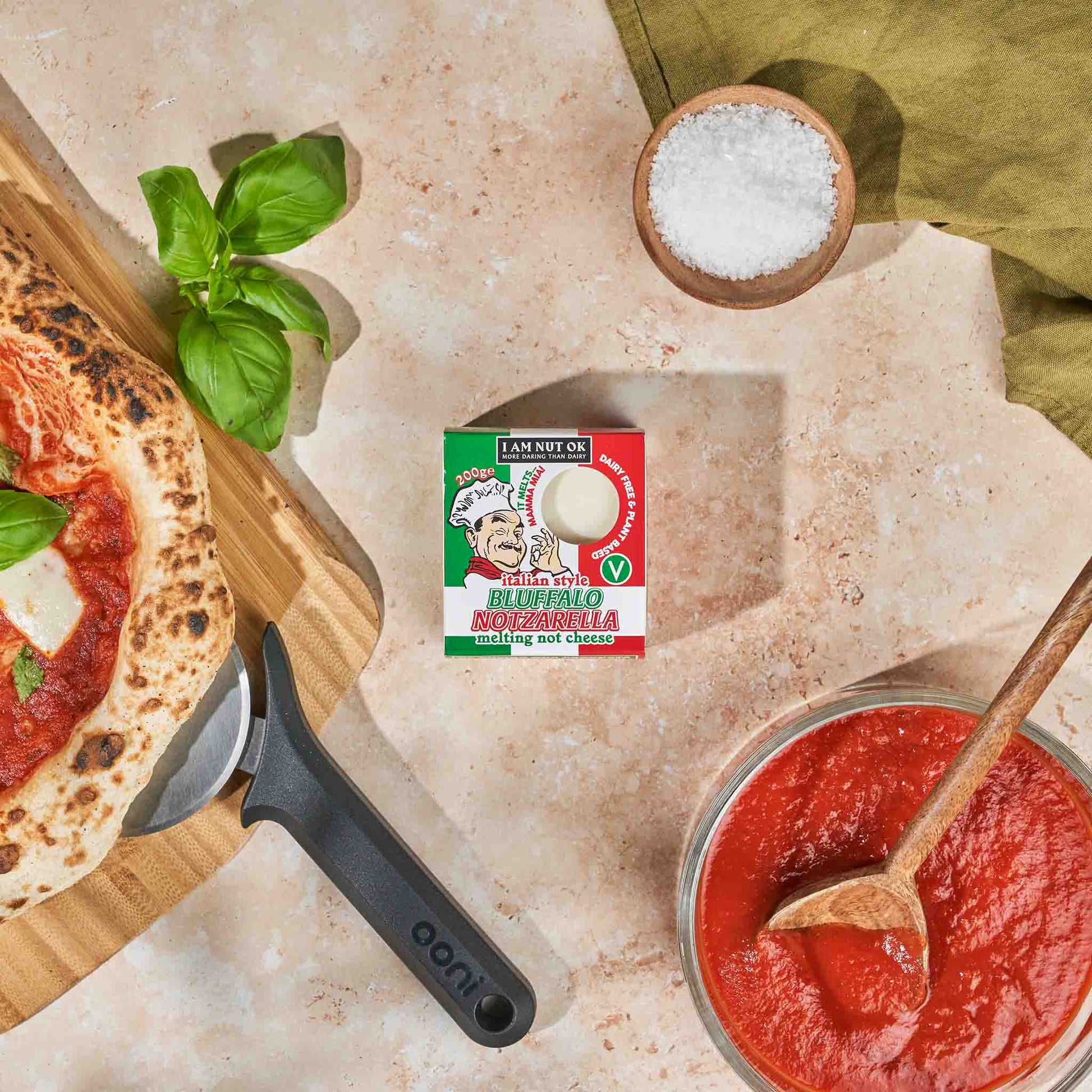 Hand-picked by Ooni’s Co-CEO Darina Garland, this vegan mozzarella is one of the best cheese substitutes we’ve ever found. Created by the incredibly cool team at I Am Nut Ok, Bluffalo Notzarella is made from soya milk and bursting with flavour.